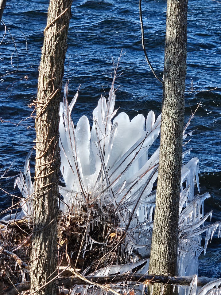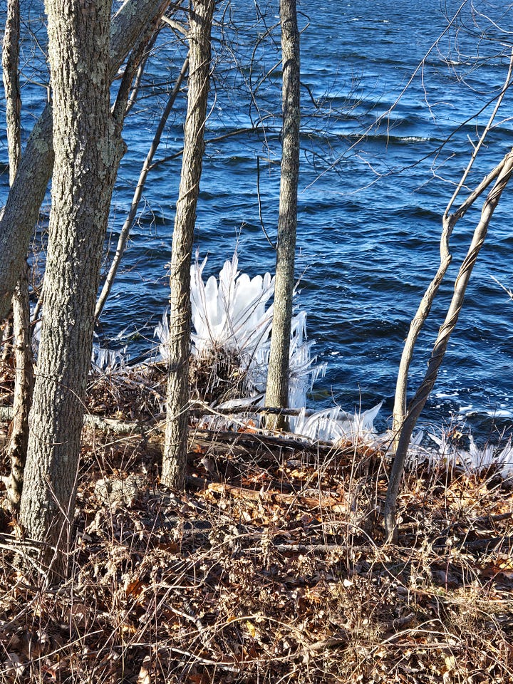 At nearby Fresh Pond last week, temperatures dropped abruptly and bitter wind delivered whitecaps. The result: ice sculptures all along the pond’s banks. Even 18 degree wind has its beautiful side!